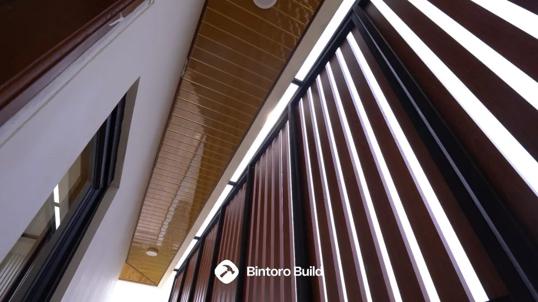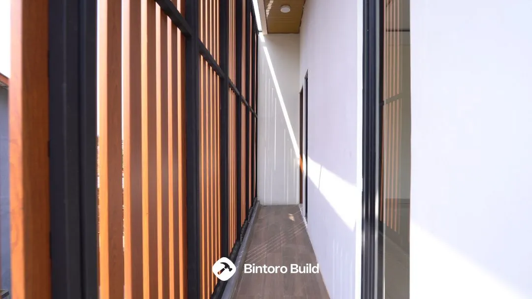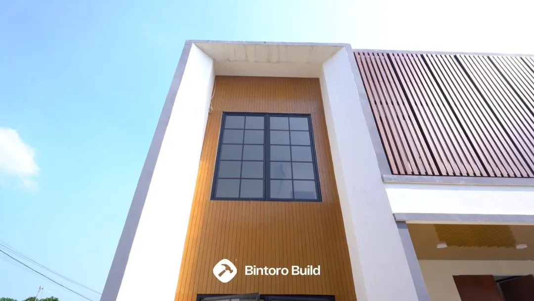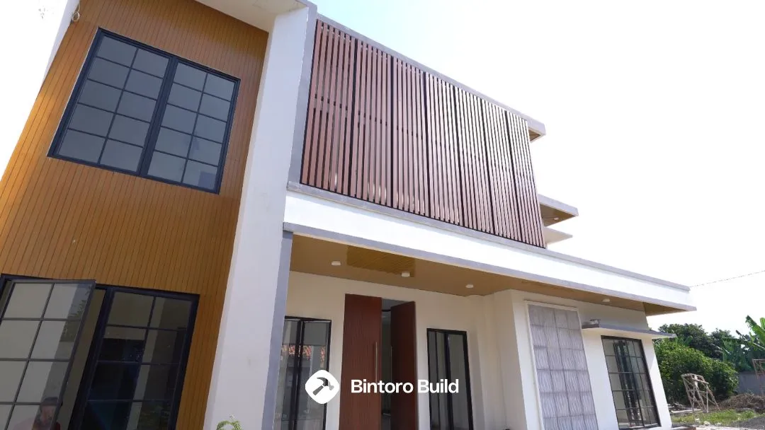 Rumah dua lantai ini mengusung gaya modern dengan sentuhan minimalis, menonjolkan kombinasi fasad putih bersih dan aksen kayu horizontal yang hangat. Atap berwarna cokelat bata menambah kesan klasik pada desain kontemporernya, menjadikannya hunian yang stylish dan nyaman.